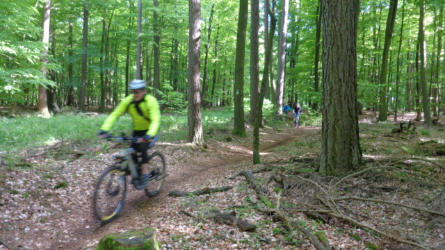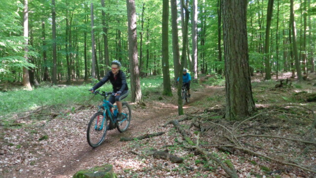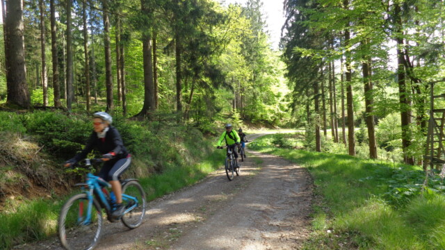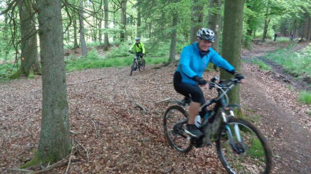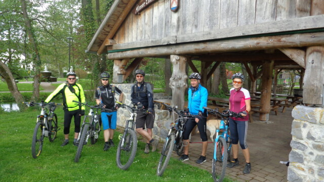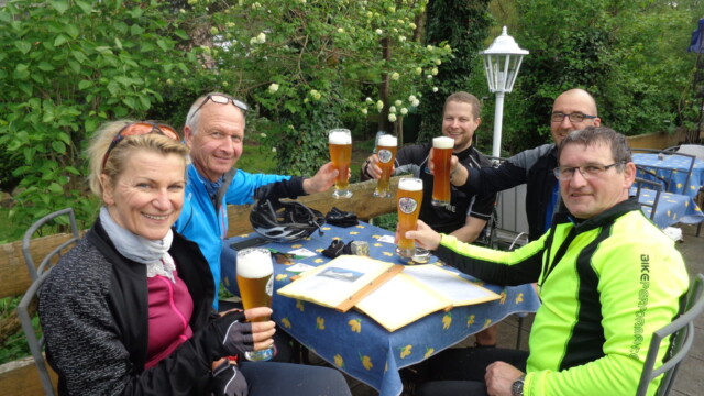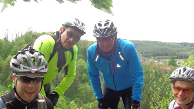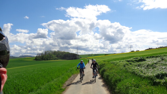Am Samstag, 20. Mai 2017 machten sich drei Mountainbiker (alle mit E-Mountainbikes) aus Brilon, Bontkirchen und Altenbüren zusammen mit dem Guide Holger Stratmann und Mario Egger, der als Begleitung zur Unterstützung der Gruppe mitfuhr bei sonnigem Wetter auf, um schöne Wege rund um Alme kennen zu lernen. Die Gruppe startete in Richtung Mesternholz nach Nehden, vorbei am Uhufelsen wo die ersten schmalen Trails gefahren wurden und die Aussicht hoch über Alme auf die Radler wartete. Dann ging es abwärts ins Mühlental. Weiter durch`s Tinnenfeld in Richtung Frühstücksplatz/Sommerseite führte der Weg zum Dreiländereck Rüthen – Büren – Brilon. Am Grenzstein vorbei, befuhren die Fünf einen mit Heide gesäumten Trail bergab in Richtung Ringelstein. Nach einer verdienten Pause am Spechtenberg ging es wieder bergan durch sonnengelbe Rapsfelder über den Borgmeierweg zurück in Richtung Alme. An der Zentrale wechselten die Fahrer vom Schotterweg noch mal auf einen schmalen Grasweg entlang dem Fluss Alme und fuhren zurück zum Entenstall. Da es am Vortag ordentlich geregnet hatte, waren die Wege teilweise sehr schlammig und erforderten Geschick bei den Abfahrten, was alle gut meistern konnten. Nach gut dreieinhalb Stunden und mit 43 km in den Beinen kam eine strahlende Gruppe am Startpunkt an. Zum Abschluß gab es noch ein kühles Weizenbier im Eulenhof. Die Teilnehmer waren sich einig, das eine Wiederholung im August schon im Kalender vermerkt ist!