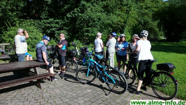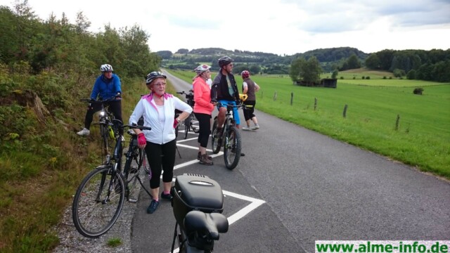 … dann schien die Sonne und ein leichter Wind begleitete die Truppe, die sich am Donnerstag, den 20.07.2017 gemeinsam auf den Weg machte. Eine 5-Dörfer-Tour, geplant und geführt von Jürgen Adams stand auf dem Sommer-Programm der Alme-AG. 15 Radler aller Altersgruppen, der älteste 73 Jahre alt, aus der Umgebung trafen sich am Almer Entenstall, um knappe 40 km unter die Räder zu nehmen. Die Fahrt ging durch Oberalme bis ins Tinnenfeld in Richtung Wülfte, über die „Fünf Brücken“ hinab zu den Aamühlen. Vorbei am sogenannten „Briloner Hexenstein“ bis zum Steinbruch. Zwischendurch gab es immer wieder wunderbare Ausblicke auf schon goldgelbe Felder in der Abendsonne sowie grüne Wälder und weite Täler. Weitere Punkte der Tour waren der Bilstein, der Flugplatz in Thülen und das Gut Almerfeld. Wieder in Alme angekommen waren sich alle einig, das diese Tour ein schönes Erlebnis war, welches unbedingt wiederholt werden muß! Ein verdientes kühles Blondes gab es dann noch zum Abschluss in der „Klöne“.
