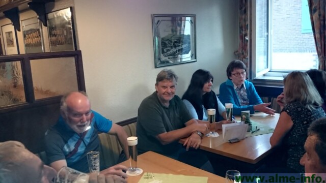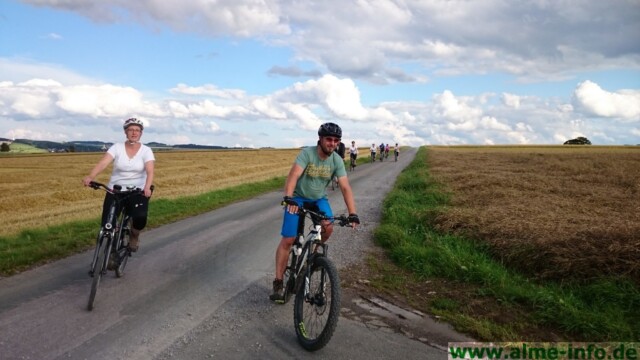 … dann schien die Sonne und ein leichter Wind begleitete die Truppe, die sich am Donnerstag, den 20.07.2017 gemeinsam auf den Weg machte. Eine 5-Dörfer-Tour, geplant und geführt von Jürgen Adams stand auf dem Sommer-Programm der Alme-AG. 15 Radler aller Altersgruppen, der älteste 73 Jahre alt, aus der Umgebung trafen sich am Almer Entenstall, um knappe 40 km unter die Räder zu nehmen. Die Fahrt ging durch Oberalme bis ins Tinnenfeld in Richtung Wülfte, über die „Fünf Brücken“ hinab zu den Aamühlen. Vorbei am sogenannten „Briloner Hexenstein“ bis zum Steinbruch. Zwischendurch gab es immer wieder wunderbare Ausblicke auf schon goldgelbe Felder in der Abendsonne sowie grüne Wälder und weite Täler. Weitere Punkte der Tour waren der Bilstein, der Flugplatz in Thülen und das Gut Almerfeld. Wieder in Alme angekommen waren sich alle einig, das diese Tour ein schönes Erlebnis war, welches unbedingt wiederholt werden muß! Ein verdientes kühles Blondes gab es dann noch zum Abschluss in der „Klöne“.