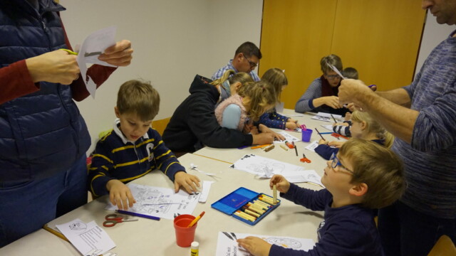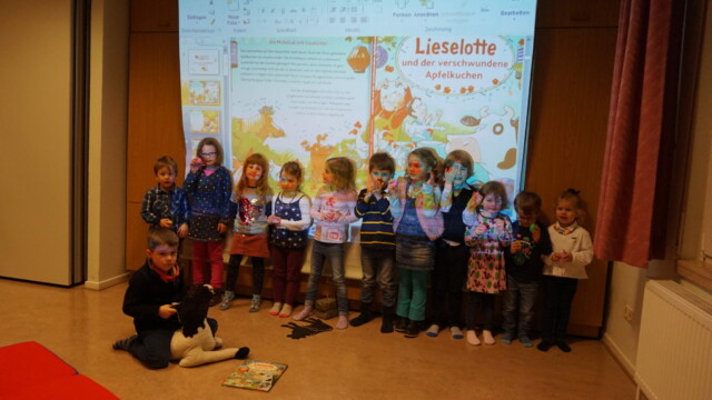 14 Kinder kamen zusammen mit ihren Eltern ins Thomas-Morus-Haus, um dem Geheimnis des verschwundenen Apfelkuchens auf die Spur zu kommen. Nachdem die Bilder des Muhsical über die Leinwand geflimmert sind, Lieder zu hören waren und der Text dazu erzählt wurde, konnten die Kids passend zum Thema eine Faltkuh basteln oder Ausmalbilder mit Kuh Lieselotte, Pferd und Trecker anmalen.