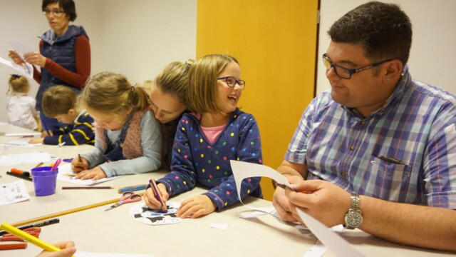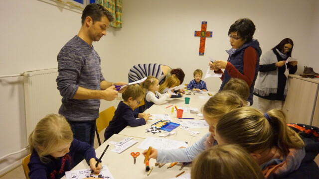 14 Kinder kamen zusammen mit ihren Eltern ins Thomas-Morus-Haus, um dem Geheimnis des verschwundenen Apfelkuchens auf die Spur zu kommen. Nachdem die Bilder des Muhsical über die Leinwand geflimmert sind, Lieder zu hören waren und der Text dazu erzählt wurde, konnten die Kids passend zum Thema eine Faltkuh basteln oder Ausmalbilder mit Kuh Lieselotte, Pferd und Trecker anmalen.