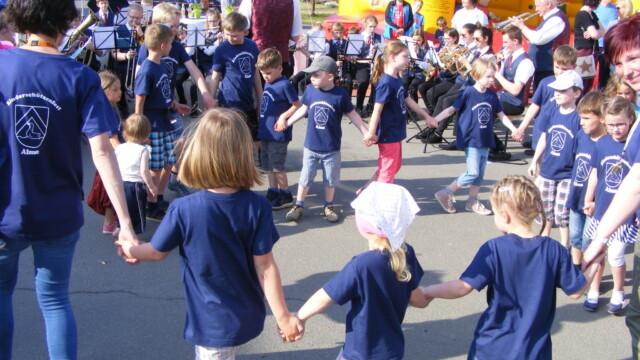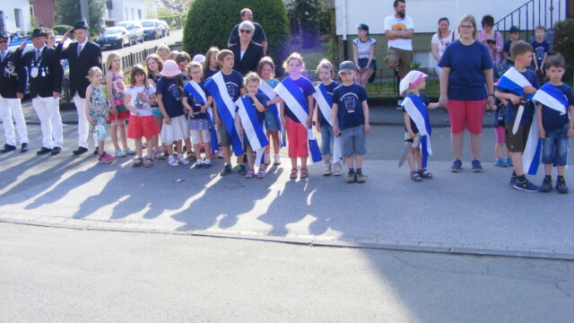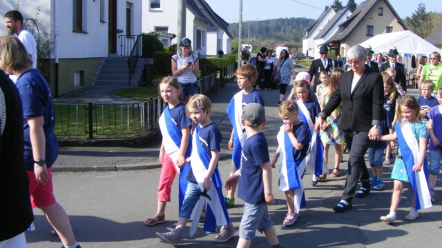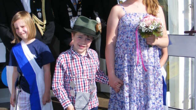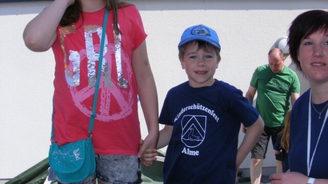 Der Familientreff Alme konnte bei sommerlichen Temperaturen etliche Kinder begrüßen, die nach Vergabe der Vorstandposten, Antreten und kurzem Wortgottesdienst das Fest mit einem kleinem Umzug unter Begleitung einer Abordnung der Almer Schützenbruderschaften starteten. Anschließend folgte ein spannender Wettstreit beim Abwerfen des Vogels. Eltern, Freunde und Gäste verfolgten interessiert die Ermittlung des neuen Königspaares. Nach einem gezielten Wurf erlangte Anne – Marie Schröder die Königinnenwürde, als König erkor sie sich Ihren Bruder Paul. Etwas später folgte dann unter Begleitung der Jungmusiker des Musikvereins Alme die Proklamation, der große Schützenumzug und Königstanz.