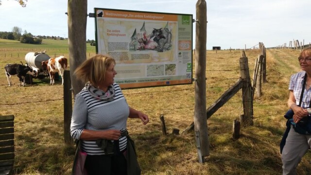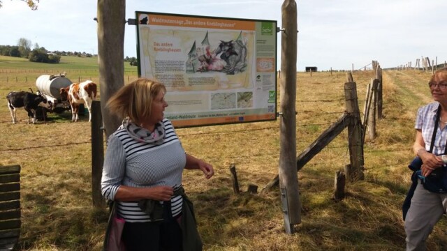 Von der Sommerseite wanderte man weiter, überquerte die B 480, Richtung Wülfte. An der Waldrouten-Info-Tafel „Das andere Kneblinghausen“, konnte Doris Seifert die Teilnehmer mit ihren herrlich emotionalen Erzählungen von abenteuerlich-schaurigen Sagen begeistern.