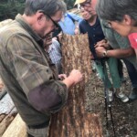 Auf einer Hochfläche am Zollpfosten konnte weit über das forstwirtschaftliche Dreiländereck Briloner Forst, Bürener Forst und Spee’scher Forst hinweggeschaut werden. Auch in diesen Nachbarwäldern waren die Schäden deutlich sichtbar. Unterwegs gab es dann wieder Anschauungsmaterial. Gezeigt wurde die Unterseite der großen Rinde einer geschlagenen Fichte. Hier wurde deutlich, wie intensiv der Borkenkäfer eine Vielzahl von Gängen in kurzer Zeit durch das Holz gräbt. Selbst am toten Holz waren hier noch einige Käfer verschiedener Altersgruppen sichtbar.