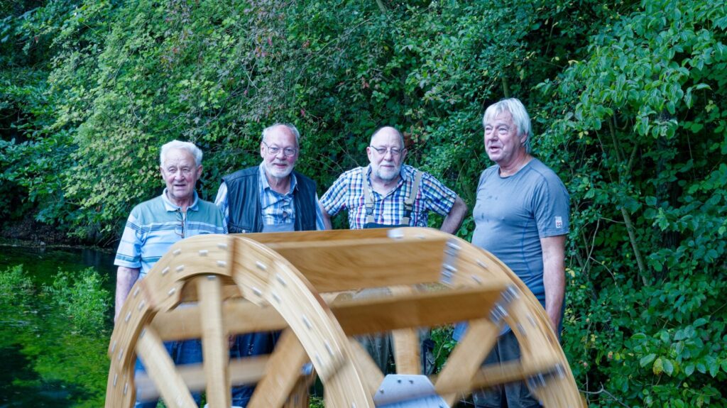 Das alte Wasserrad von 2006 hatte im wahrsten Sinne des Wortes „Moos angesetzt“ und wurde durch ein neues an gleicher Stelle ersetzt. Diente es früher mit seinen Schöpfbechern zur Befüllung des Tretbeckens , so hat es heute nur noch eine touristische Funktion, ist es doch Namensgeber unseres Vereinsfestes im August.