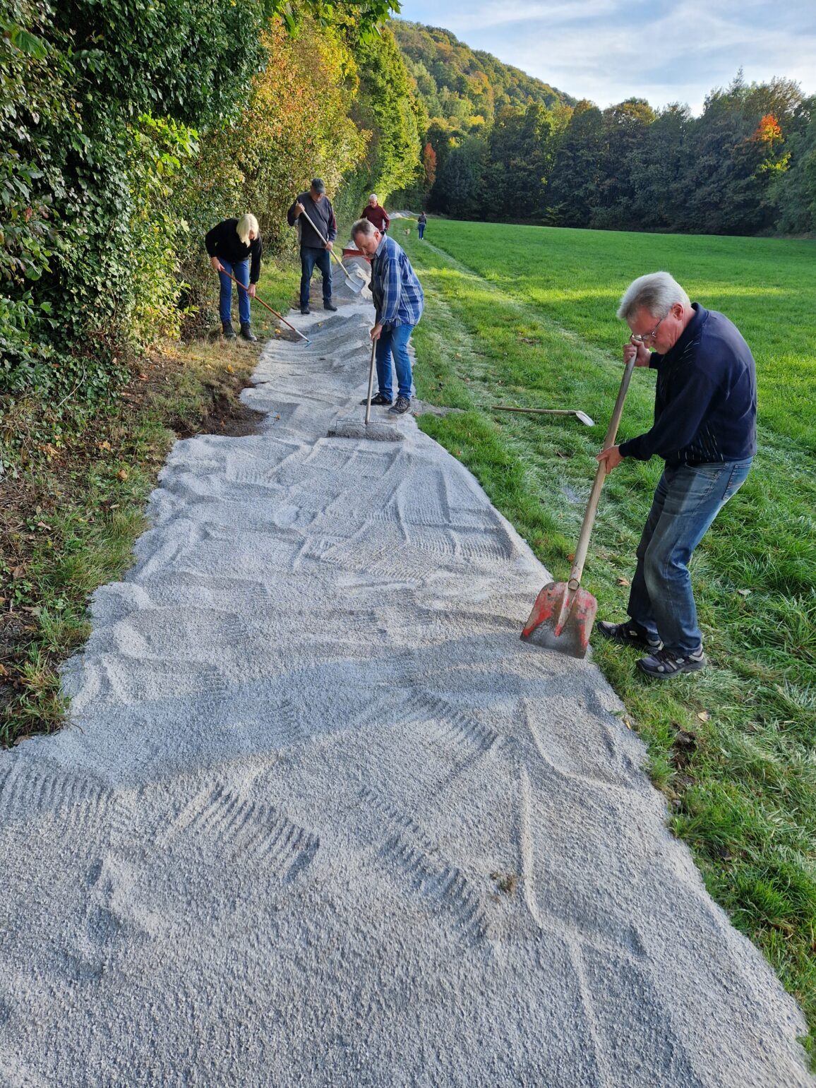 Im September wurde jetzt der Weg von der Einmündung an der Unteren Bahnhofstrasse bis zur „Alten Papierfabrik“ erneuert. Dazu wurde der Weg auf 1,20m Breite gebracht, aufgerauht, angeglichen, mit einem Sand-Kiesgemisch wieder verfüllt und angewalzt, so dass er für die nächsten Jahre wieder eine ebene Oberfläche hat.
