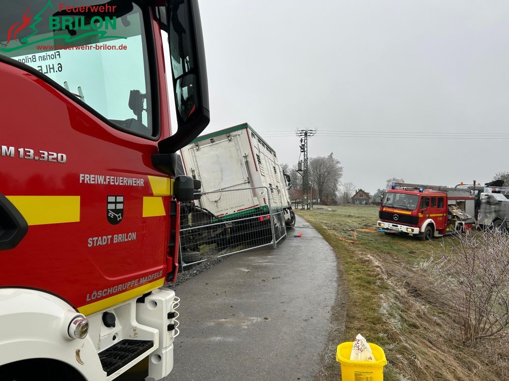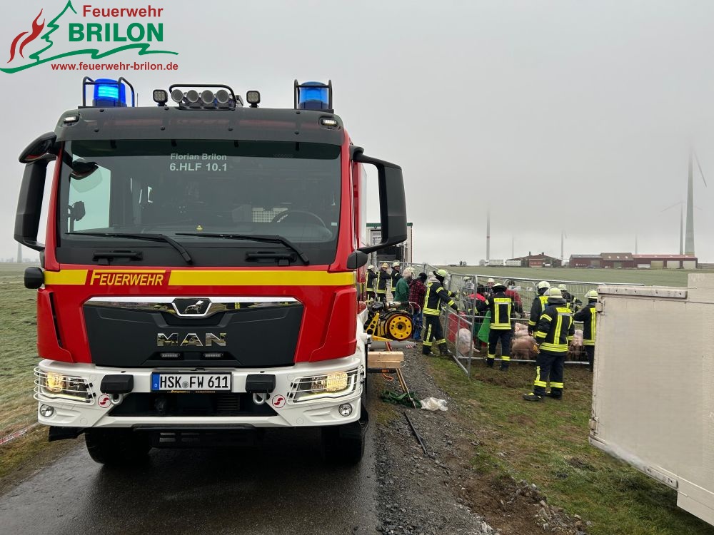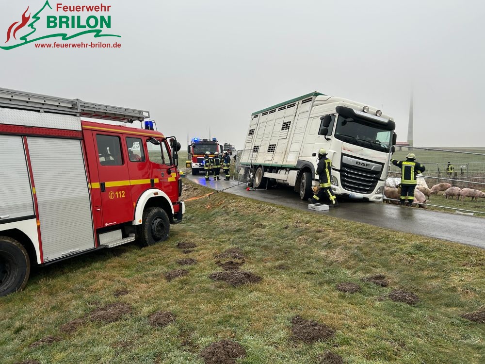 Alme. Die Löschgruppe Madfeld wurde am Samstag (14.02.) um 10:58 Uhr zu einem Hilfeleistungseinsatz nach Alme zum „Loh“, alarmiert. Vor Ort war ein LKW mit 80 Schweinen verunglückt. Der ebenfalls mit 80 Schweinen beladene, dreistöckige Anhänger lag vollständig umgekippt auf einem schmalen Feldweg. Da sich der Anhänger nicht mehr öffnen ließ, waren alle Tiere darin eingeschlossen.
