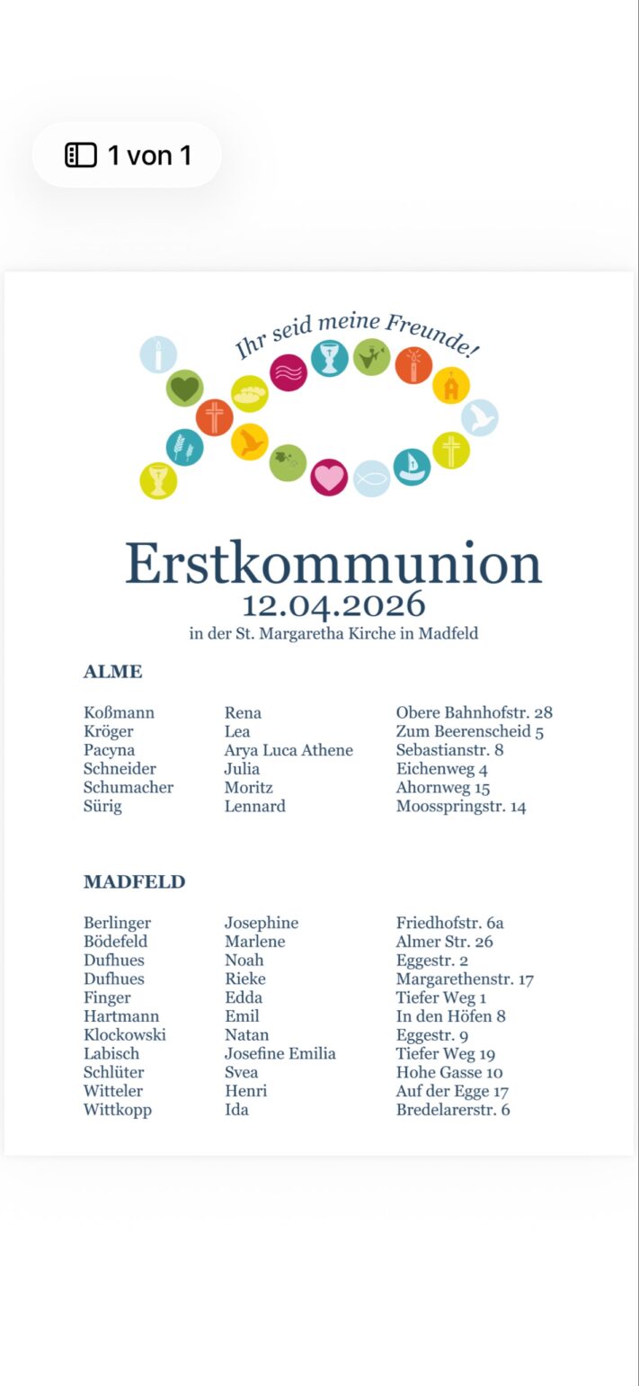 Liste für Alme und Madfeld – Hl. Messe in der St. Margaretha Kirche in Madfeld am 12.04.2026