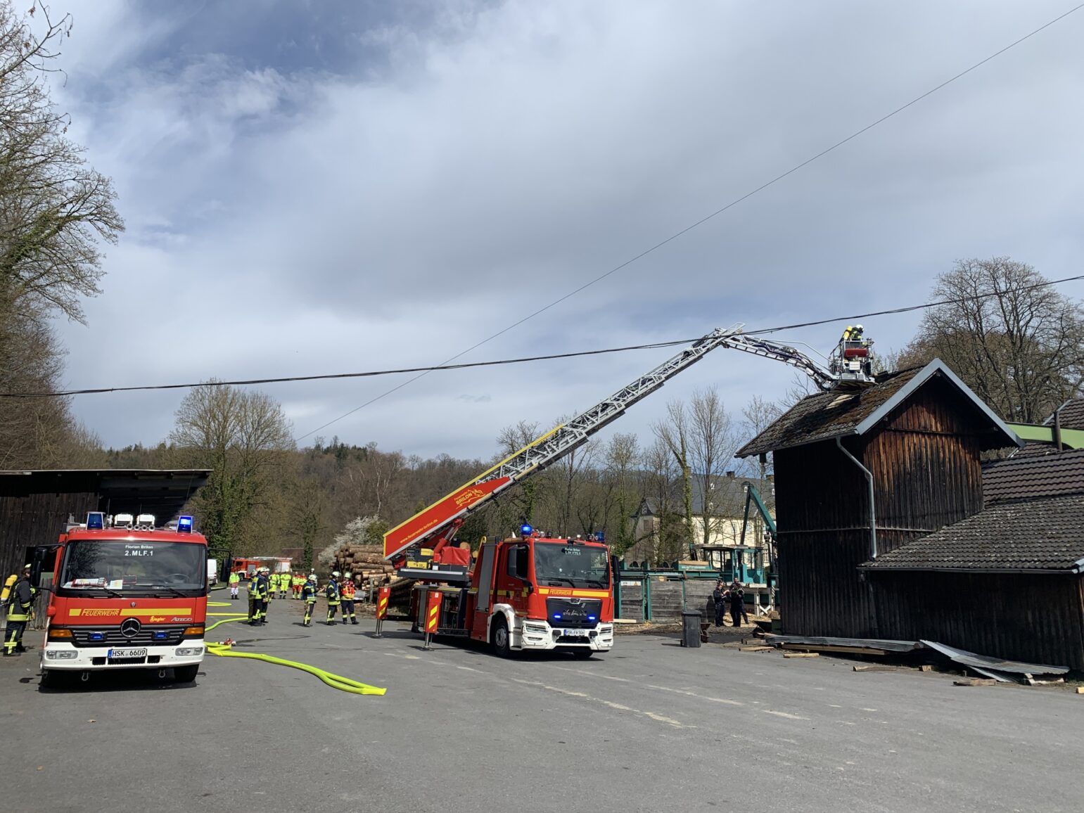 Die Feuerwehr Brilon wurde am Donnerstagmittag (09.04.2026, 12:50 Uhr) zu einem Brandeinsatz mit Menschenrettung in Alme alarmiert. Laut Alarmmeldung sollte der Dachstuhl eines Sägewerks brennen, Personen befänden sich auf dem Dach.